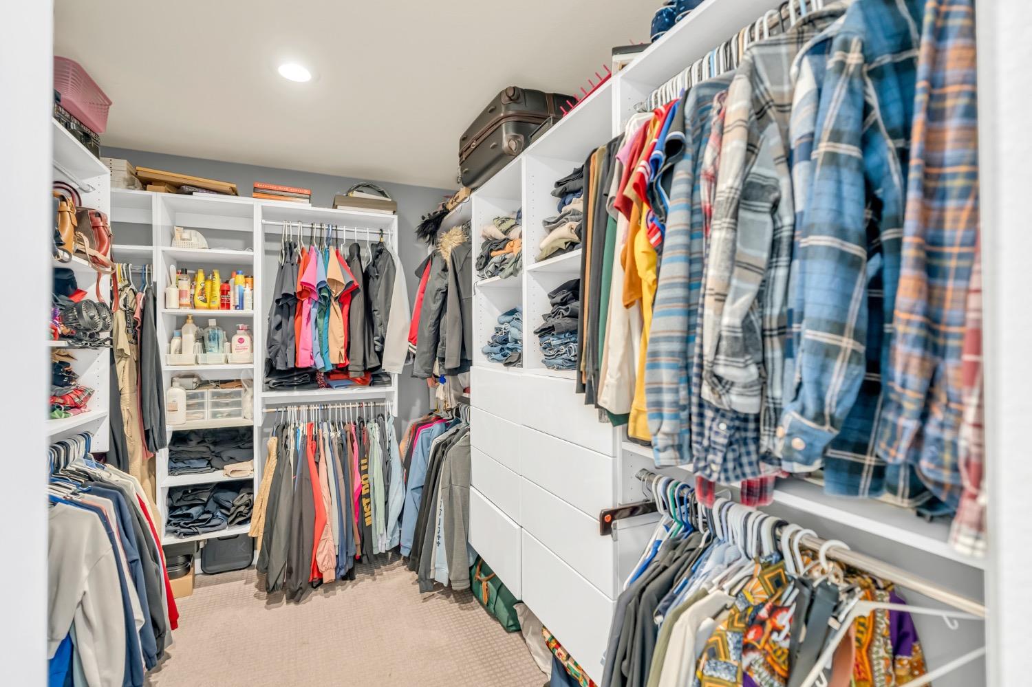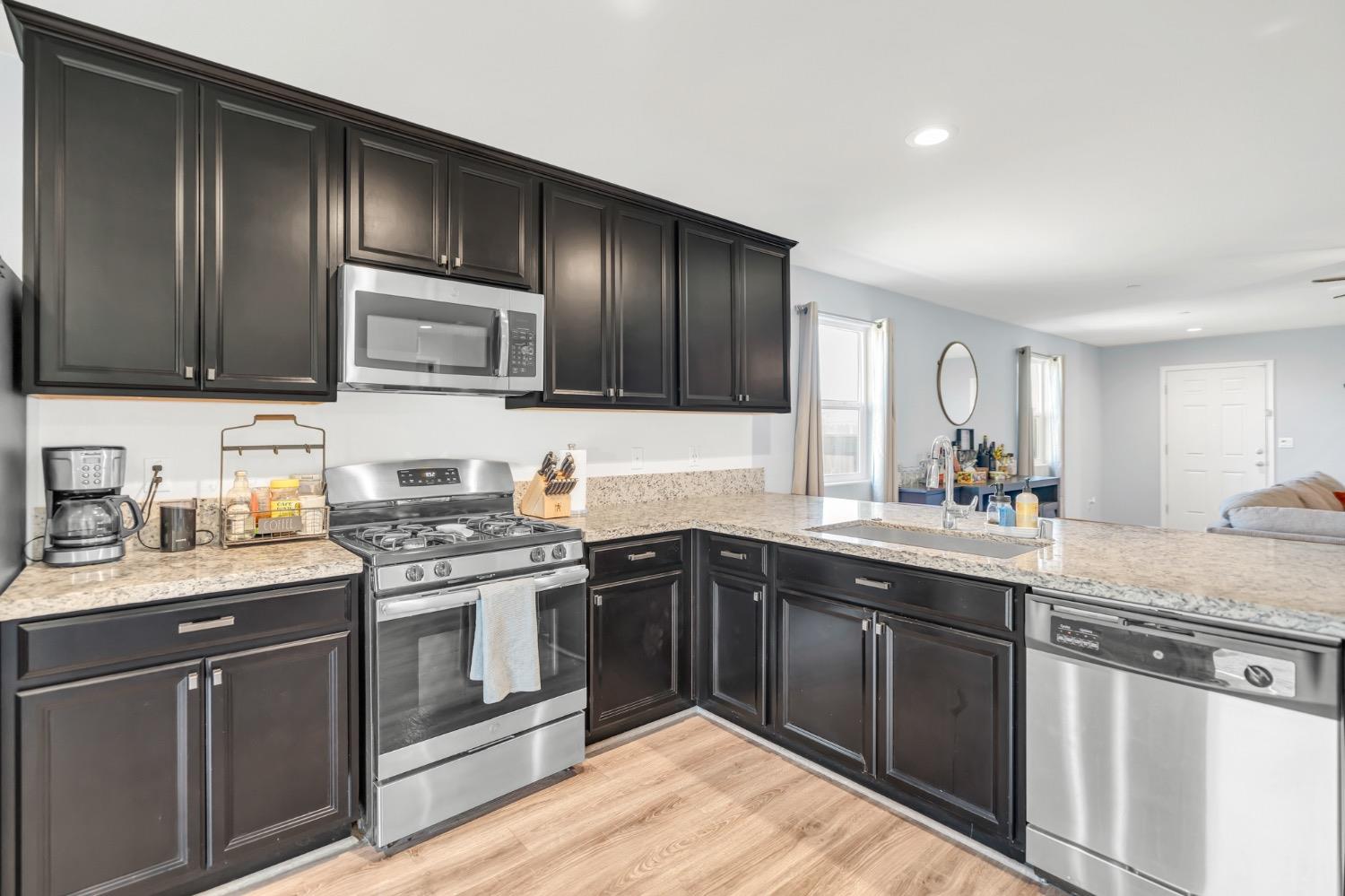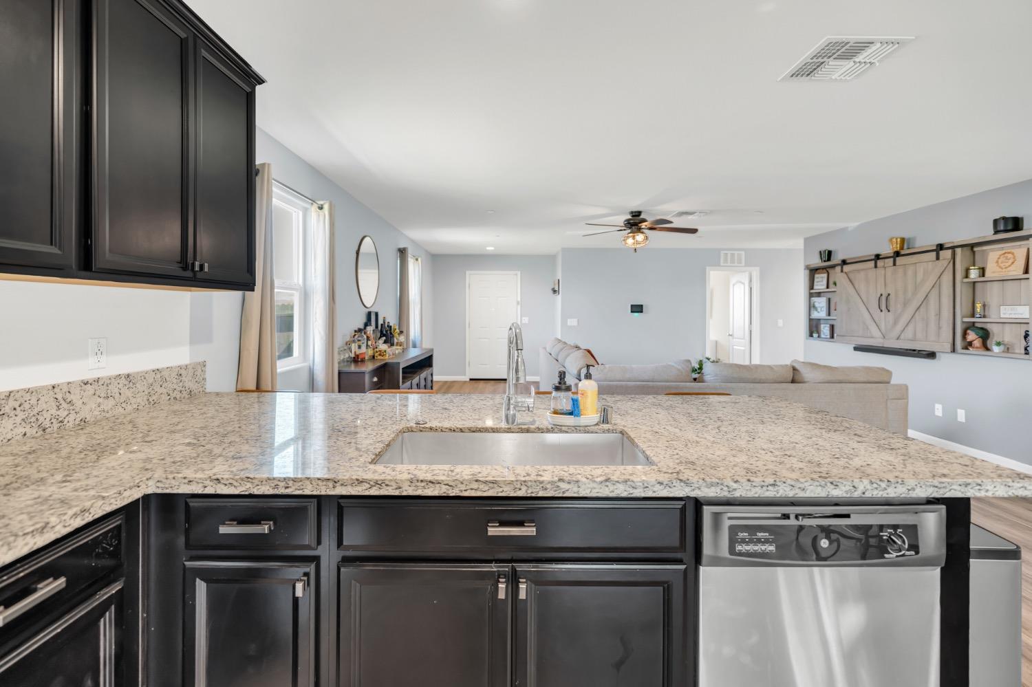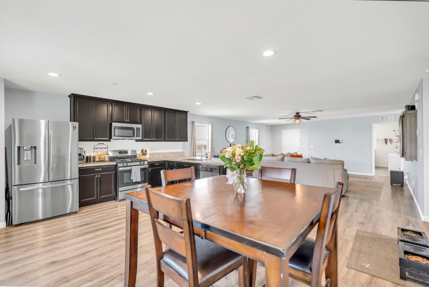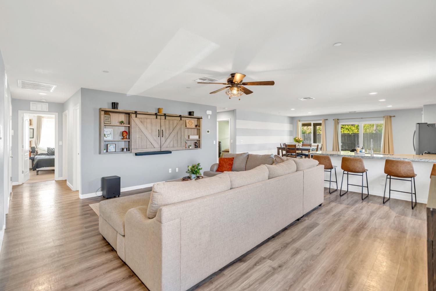 Step into this beautifully maintained home featuring an open-concept layout with a spacious great room. The kitchen seamlessly flows into the dining and family area, showcasing elegant black cabinetry, granite countertops, and stainless steel appliances. The private primary suite offers a relaxing retreat with double vanities, a walk-in shower, and a generously sized walk-in closet complete with a custom organizer. Two well-proportioned guest bedrooms are located at the front of the home, providing privacy from the primary. The guest bathroom includes a single-sink vanity and a convenient tub/shower combo. Enjoy added functionality in the laundry room, located just off the primary, with built-in cabinets, counter space, and custom shelving. The two-car garage is equipped with overhead storage racks and a tankless water heater for energy efficiency. Outside, the backyard features a large concrete patio with a recently added patio cover with fans. Potential RV access/boat storage as the home is situated on a large corner lot. Come check out this well maintained home!