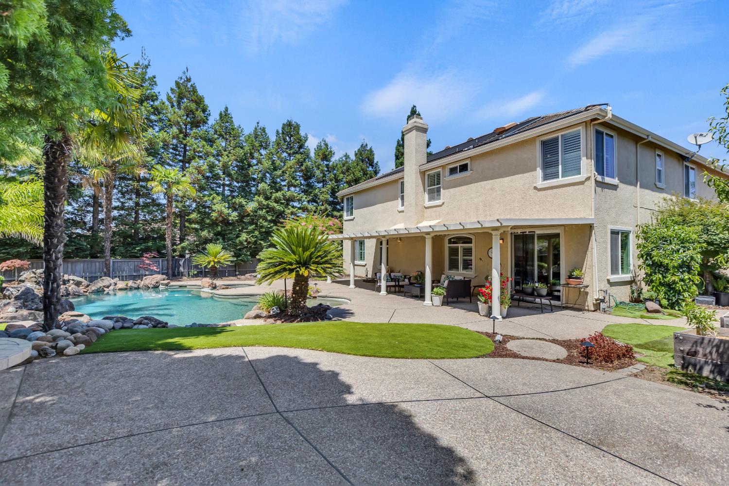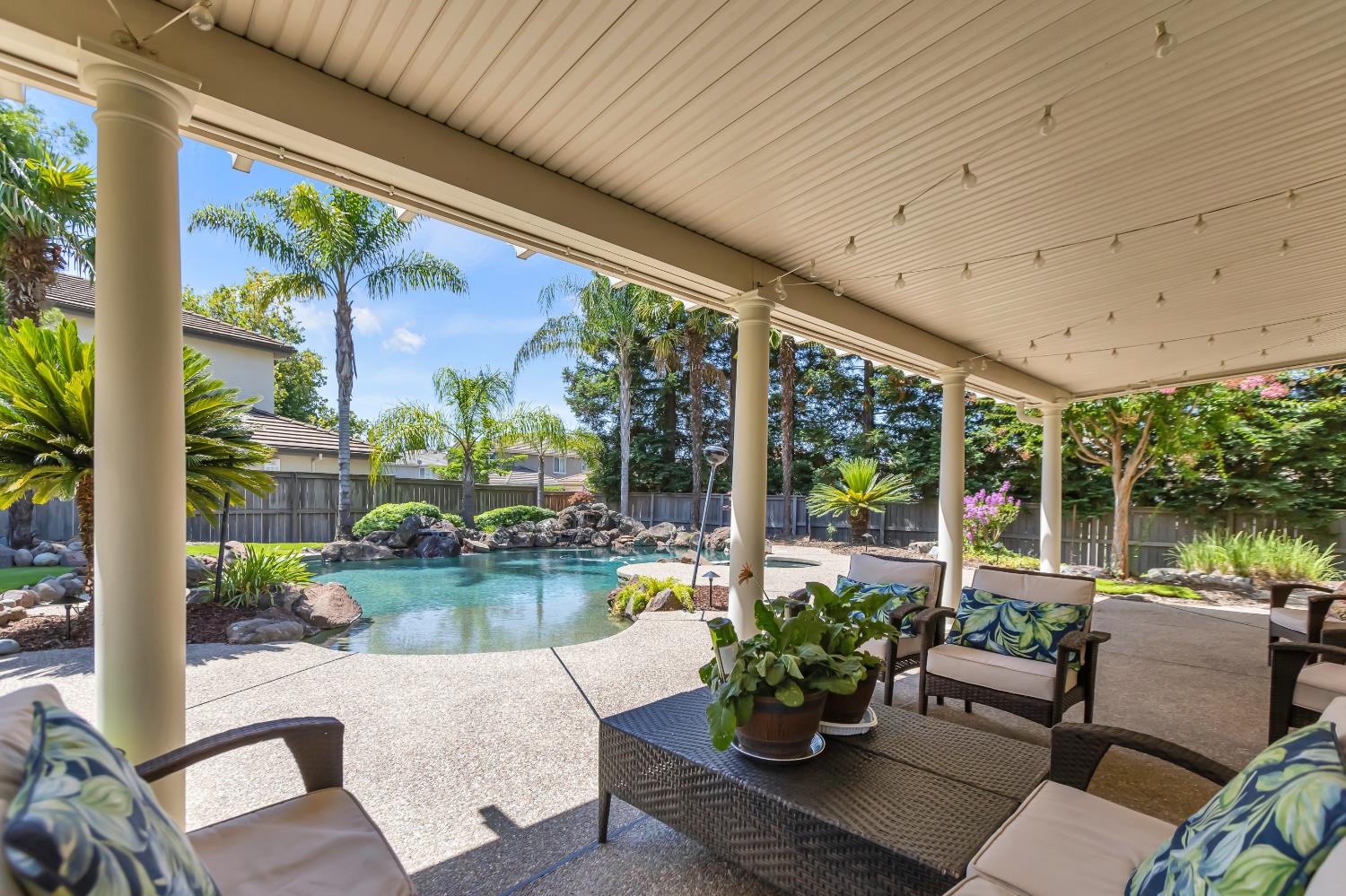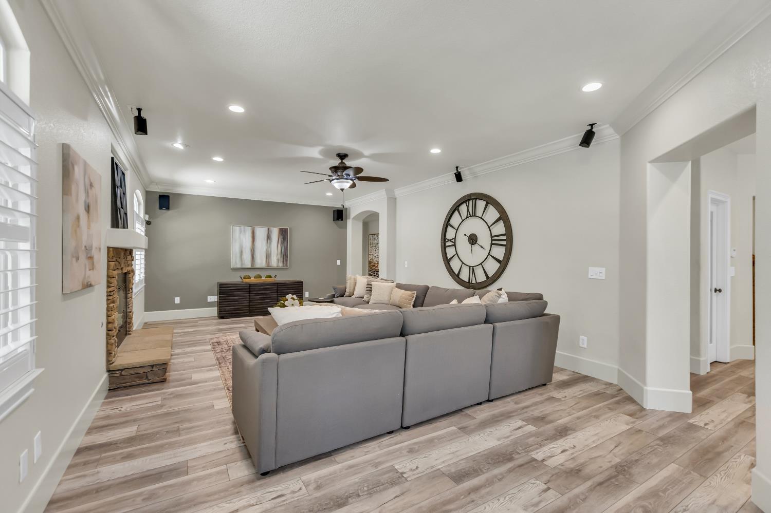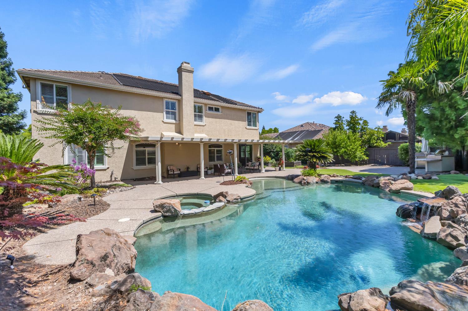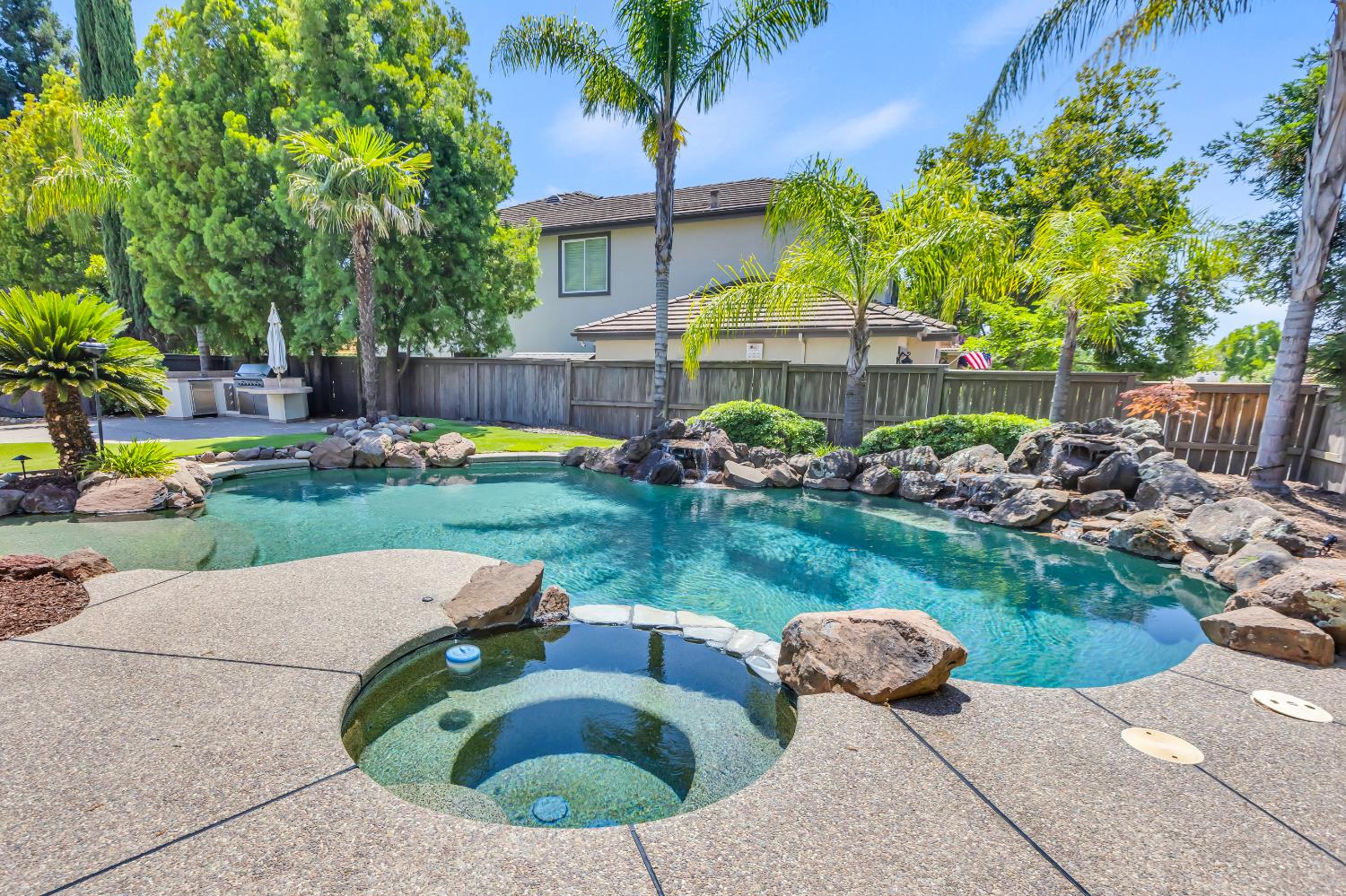 Welcome to 1456 Oak Hill Way an expansive and beautifully updated home in the gated Stoneridge community of East Roseville. Situated on a premium corner lot, this 6-bedroom, 4-bathroom home offers over 4,000 sq ft of thoughtfully designed living space, including a convenient downstairs bed and newly remodeled bath. The main level features soaring ceilings, brand-new LVP flooring, and a chef's dream kitchen with quartz countertops, a large island, walk-in pantry, and abundant cabinetry with deep pull-out drawers. Upstairs includes a massive media room perfect for movie nights or entertaining. Step outside to your private resort-style retreat with a walk-in pool, tranquil waterfalls, spa, and mature palm trees. The fully equipped DCS outdoor kitchen features a built-in grill, side burner, and storage drawers (fridge not included), alongside a large covered patio ideal for outdoor dining. Enjoy a variety of fruit trees including Asian pear, mandarin orange, avocado, nectarine, Meyer lemon, lemon, and lime. Additional highlights include a cozy fireplace, whole house fan, and rare 4-car garage. Located near top-rated schools, parks, and trails this home blends luxury, comfort, and convenience in one of Roseville's most desirable neighborhoods.