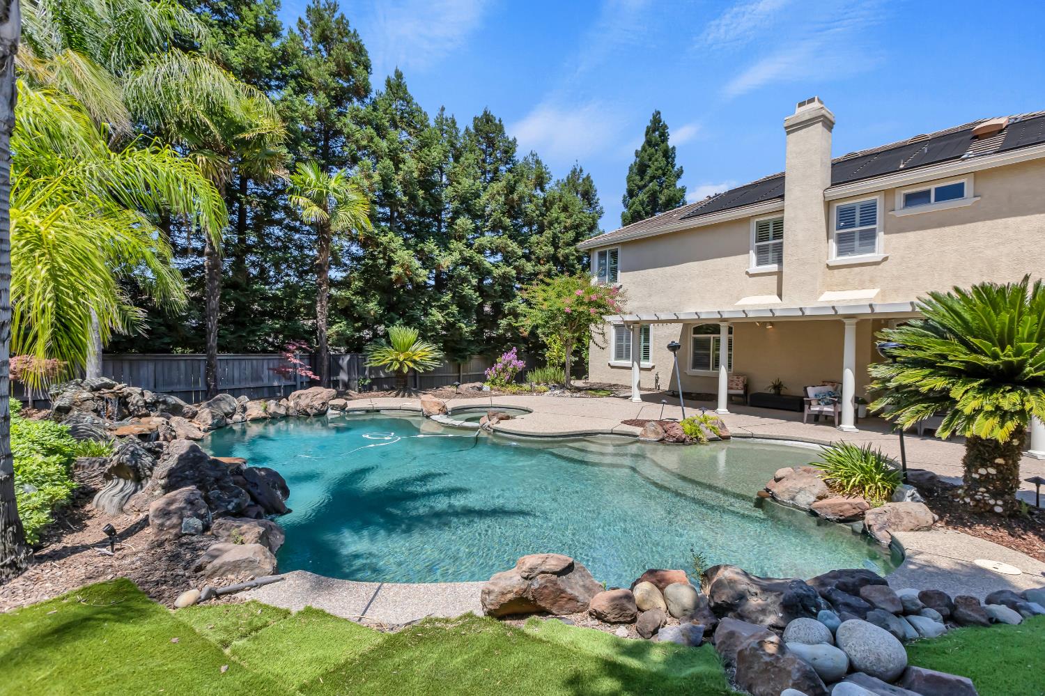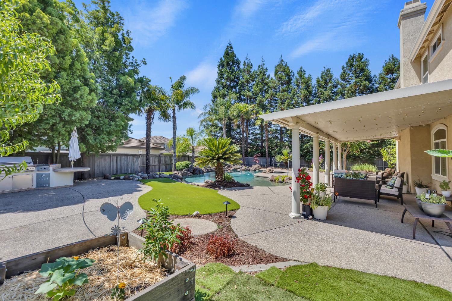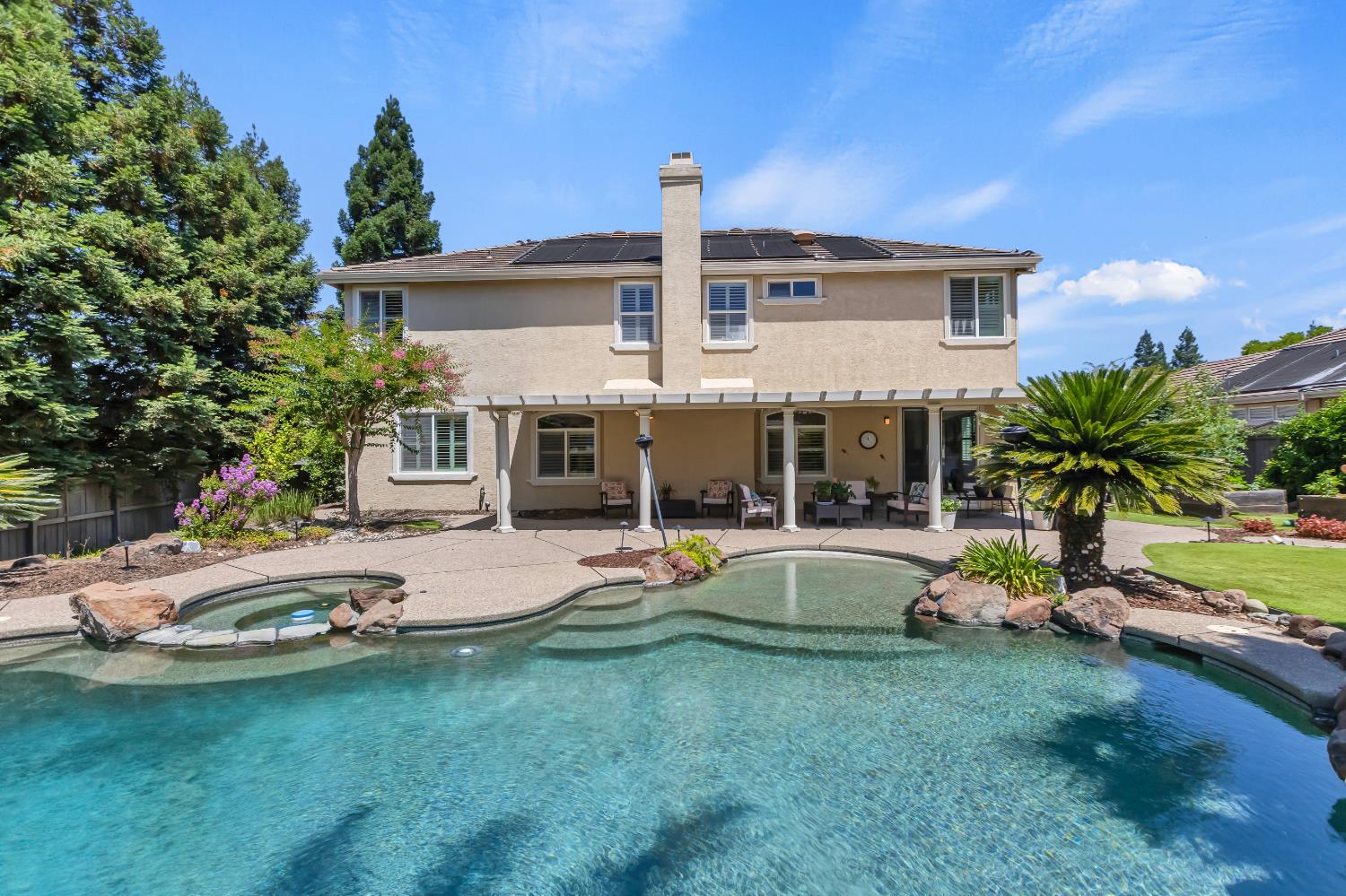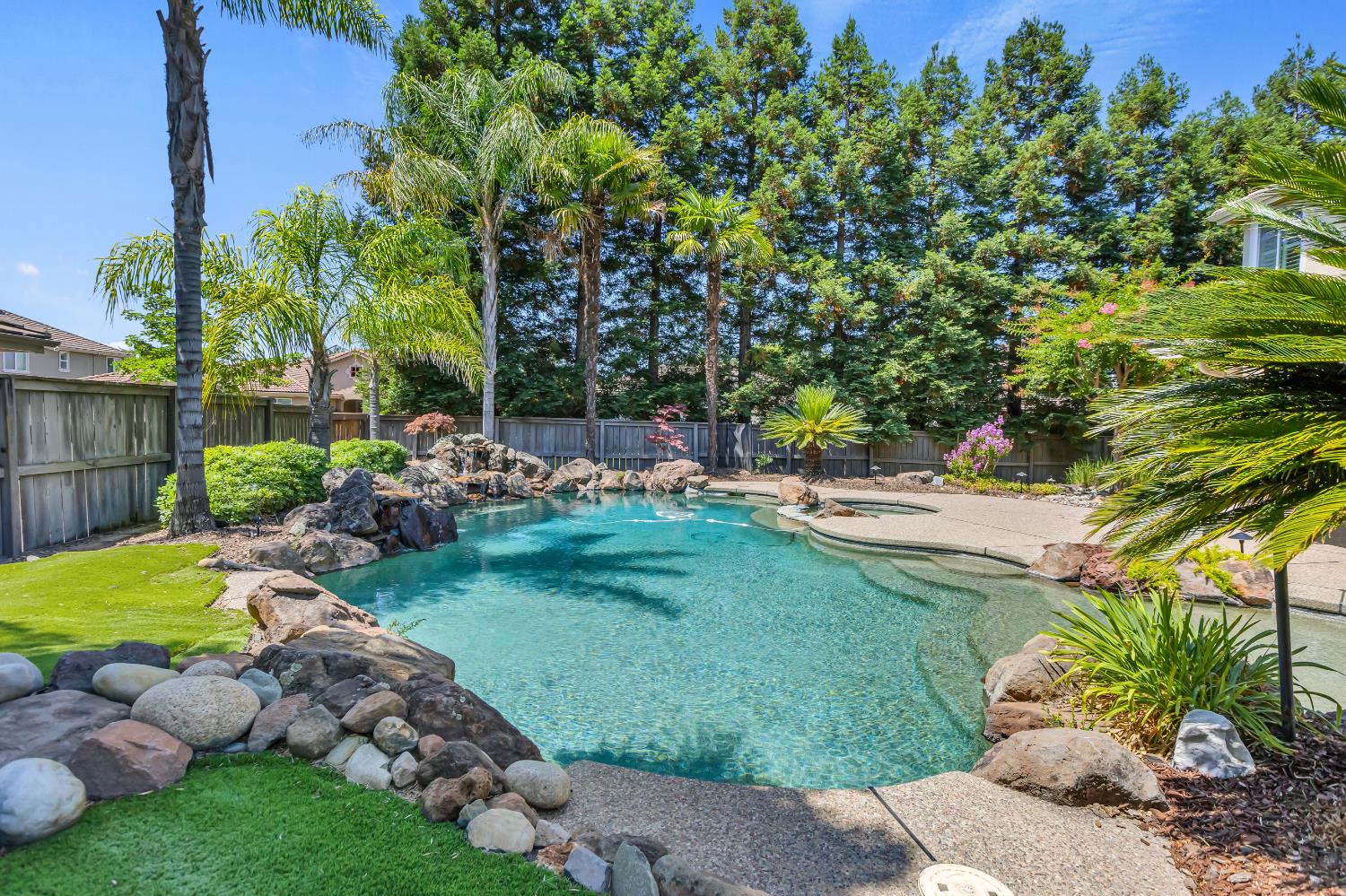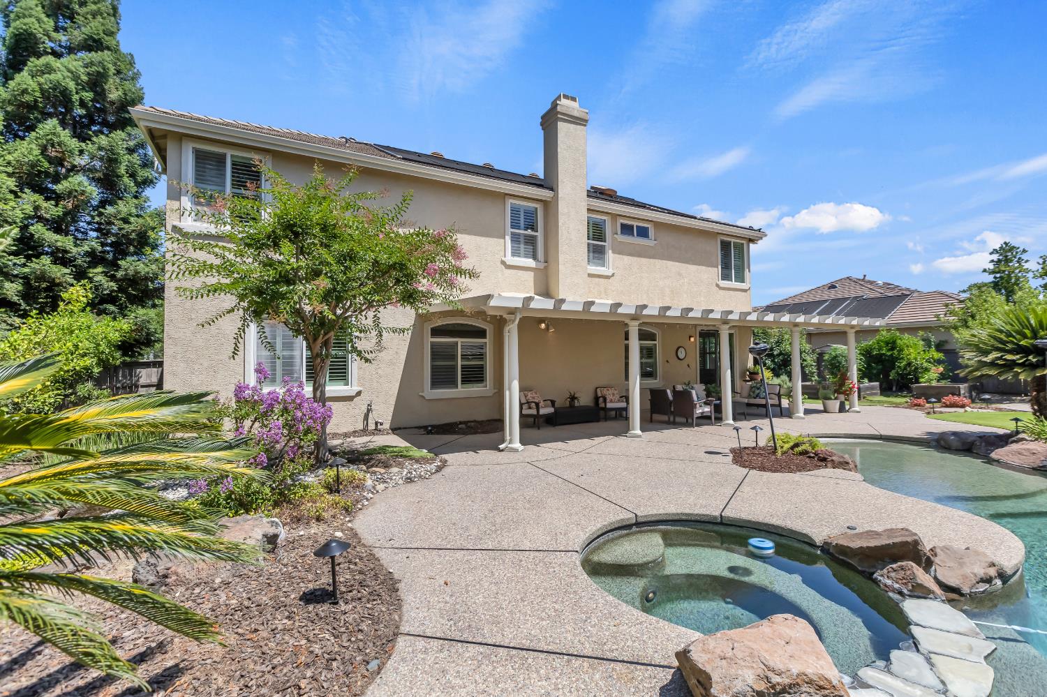 Welcome to 1456 Oak Hill Way an expansive and beautifully updated home in the gated Stoneridge community of East Roseville. Situated on a premium corner lot, this 6-bedroom, 4-bathroom home offers over 4,000 sq ft of thoughtfully designed living space, including a convenient downstairs bed and newly remodeled bath. The main level features soaring ceilings, brand-new LVP flooring, and a chef's dream kitchen with quartz countertops, a large island, walk-in pantry, and abundant cabinetry with deep pull-out drawers. Upstairs includes a massive media room perfect for movie nights or entertaining. Step outside to your private resort-style retreat with a walk-in pool, tranquil waterfalls, spa, and mature palm trees. The fully equipped DCS outdoor kitchen features a built-in grill, side burner, and storage drawers (fridge not included), alongside a large covered patio ideal for outdoor dining. Enjoy a variety of fruit trees including Asian pear, mandarin orange, avocado, nectarine, Meyer lemon, lemon, and lime. Additional highlights include a cozy fireplace, whole house fan, and rare 4-car garage. Located near top-rated schools, parks, and trails this home blends luxury, comfort, and convenience in one of Roseville's most desirable neighborhoods.