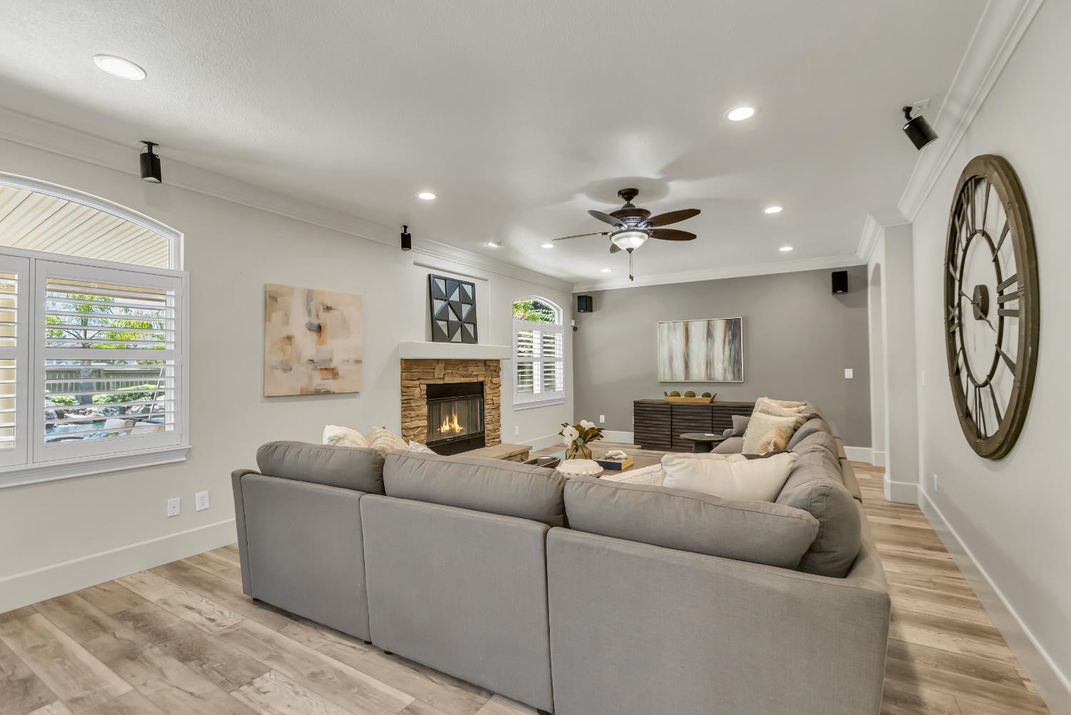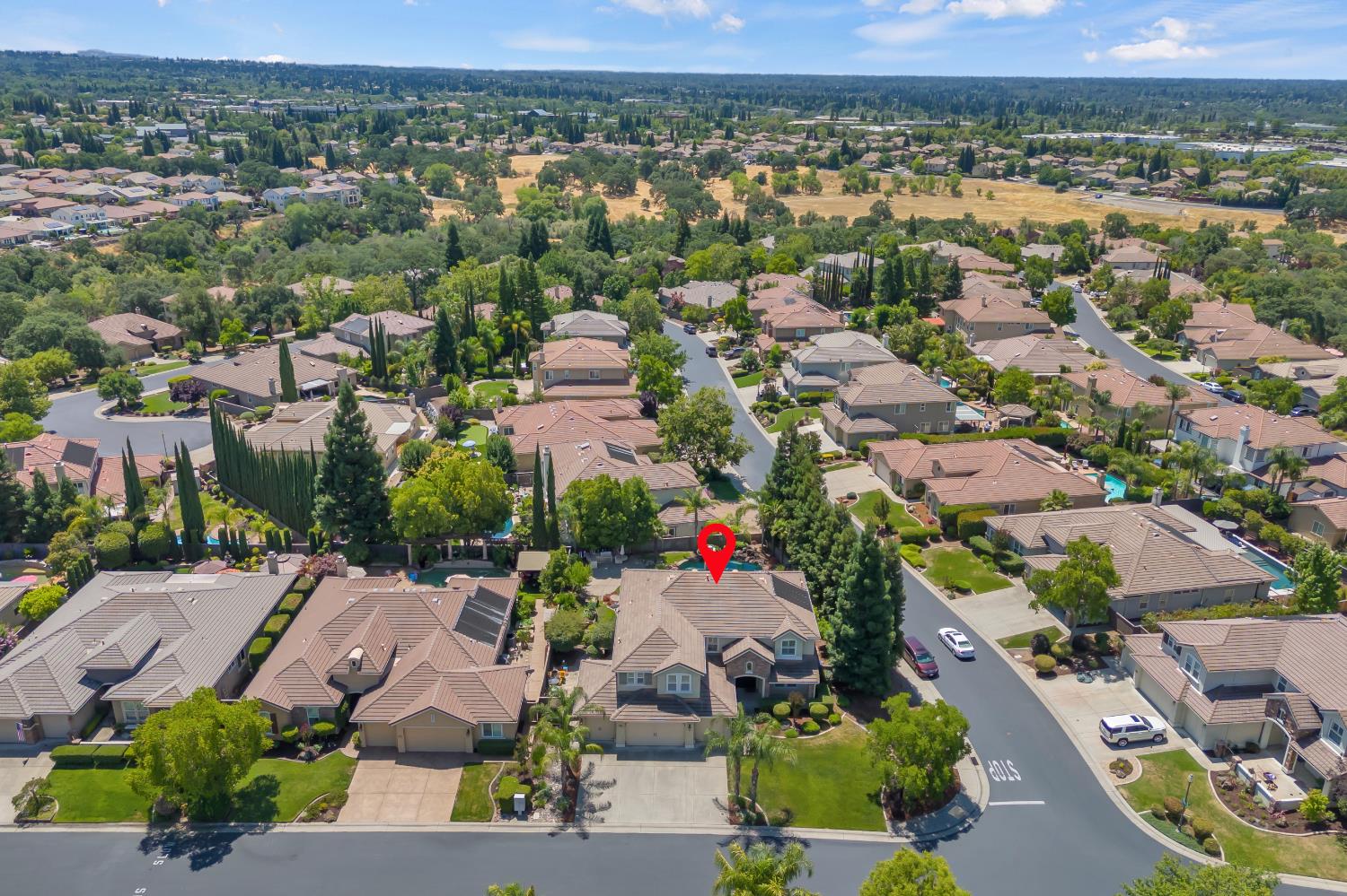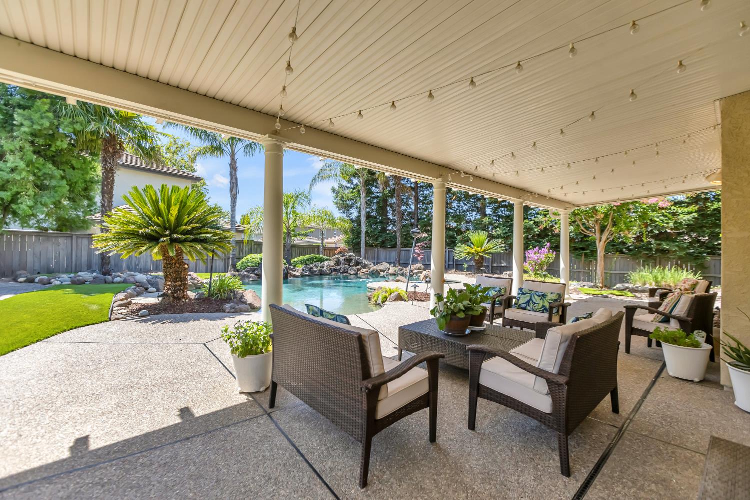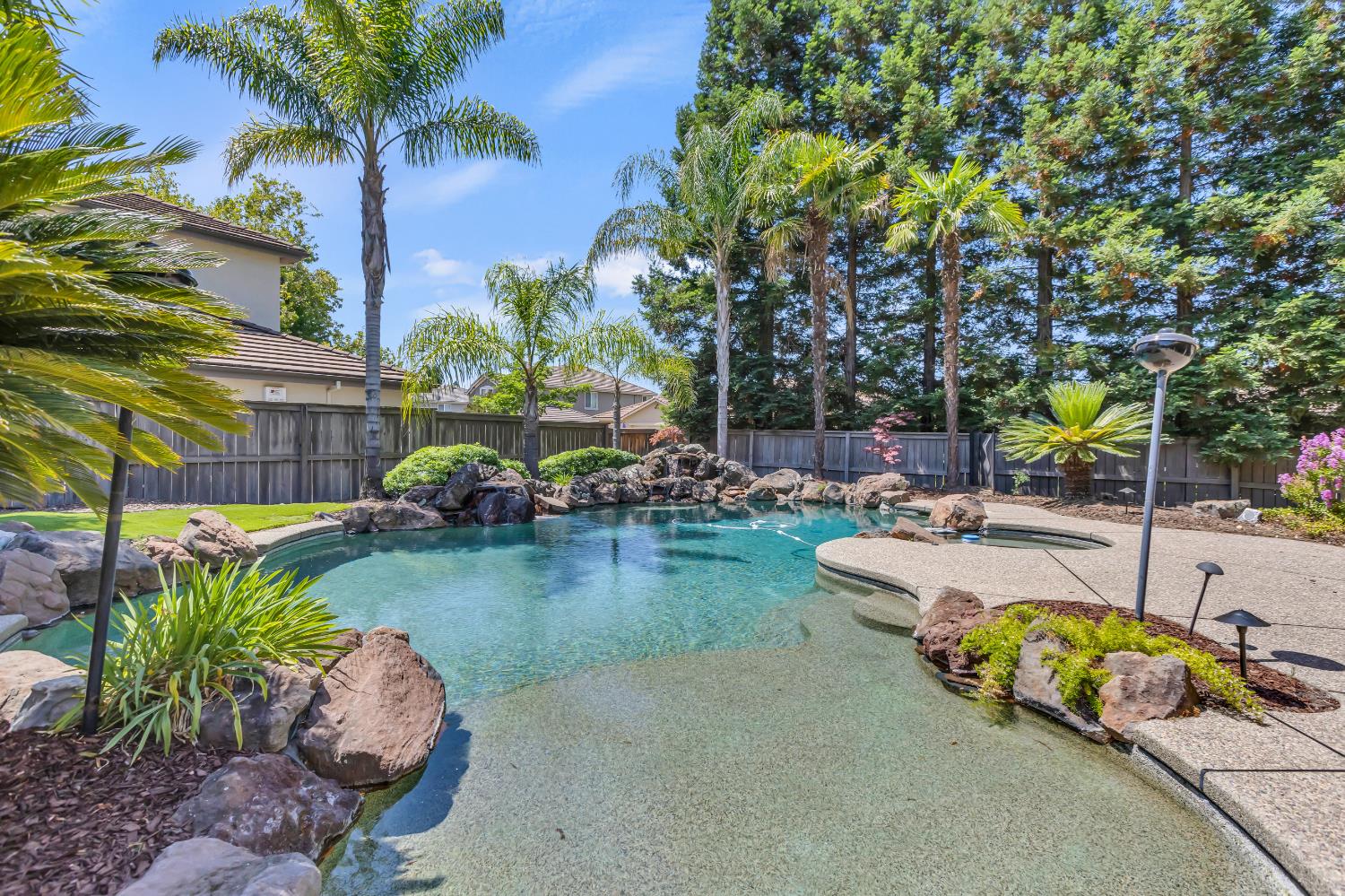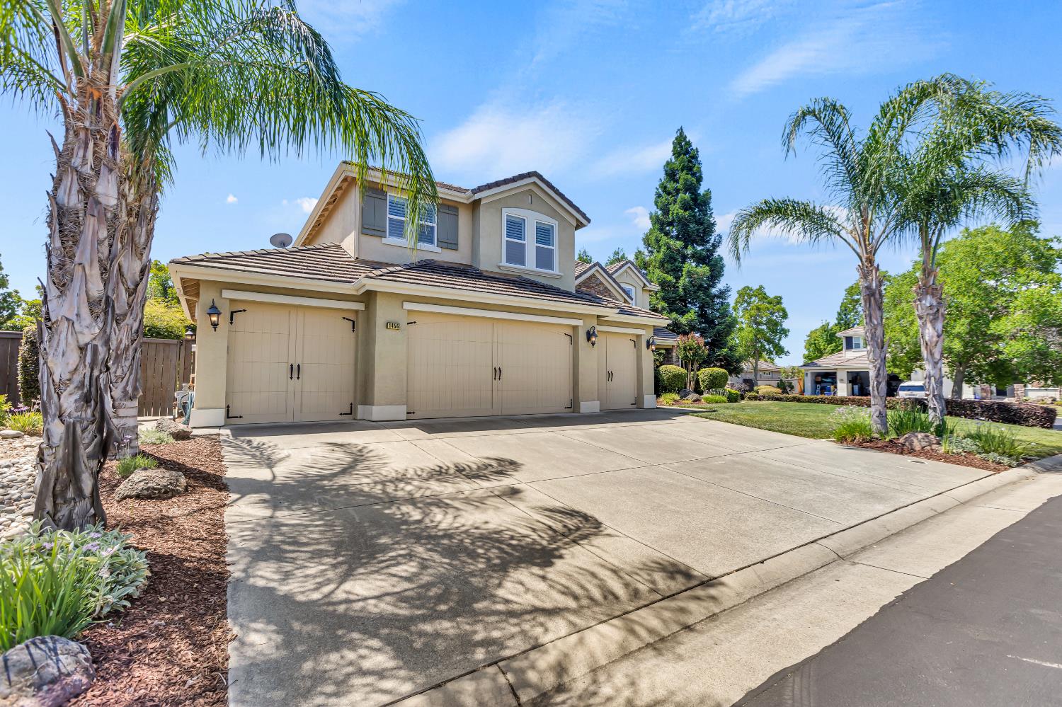 Welcome to 1456 Oak Hill Way an expansive and beautifully updated home in the gated Stoneridge community of East Roseville. Situated on a premium corner lot, this 6-bedroom, 4-bathroom home offers over 4,000 sq ft of thoughtfully designed living space, including a convenient downstairs bed and newly remodeled bath. The main level features soaring ceilings, brand-new LVP flooring, and a chef's dream kitchen with quartz countertops, a large island, walk-in pantry, and abundant cabinetry with deep pull-out drawers. Upstairs includes a massive media room perfect for movie nights or entertaining. Step outside to your private resort-style retreat with a walk-in pool, tranquil waterfalls, spa, and mature palm trees. The fully equipped DCS outdoor kitchen features a built-in grill, side burner, and storage drawers (fridge not included), alongside a large covered patio ideal for outdoor dining. Enjoy a variety of fruit trees including Asian pear, mandarin orange, avocado, nectarine, Meyer lemon, lemon, and lime. Additional highlights include a cozy fireplace, whole house fan, and rare 4-car garage. Located near top-rated schools, parks, and trails this home blends luxury, comfort, and convenience in one of Roseville's most desirable neighborhoods.